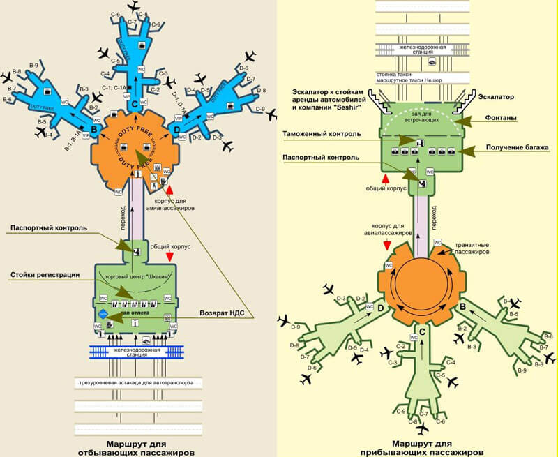 Между терминалами курсируют бесплатные шаттлы. Интервал движения — от 10 минут.