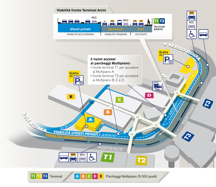 Чтобы обслуживать огромный поток пассажиров и справляться с ним в пик сезона, аэропорт «Фьюмичино» имеет несколько терминалов. Каждый из них отличается спецификой: