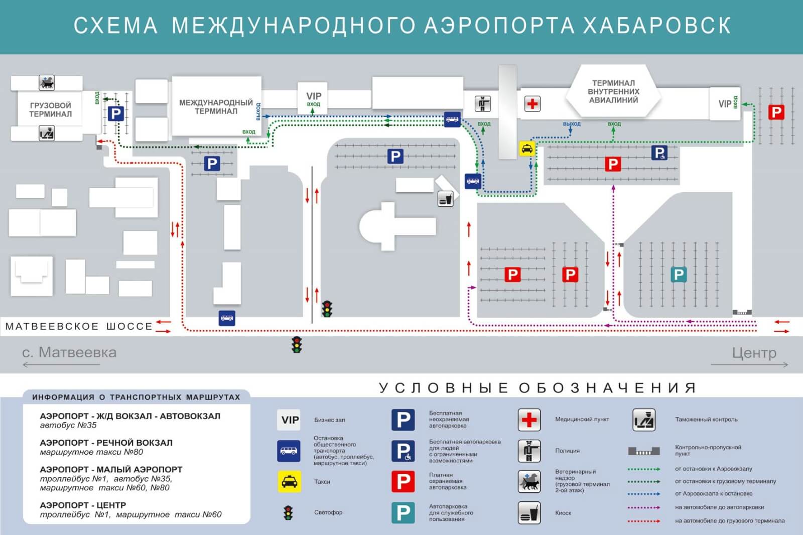Удобное расположение аэропорта Хабаровска позволяет добраться до него за 25 минут при отсутствии пробок. До терминалов можно добраться: