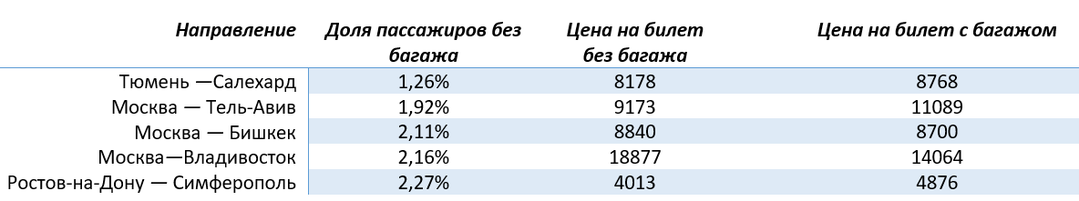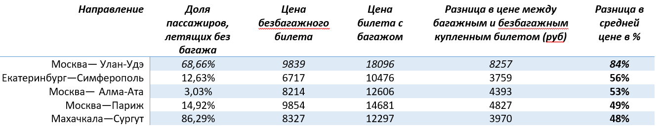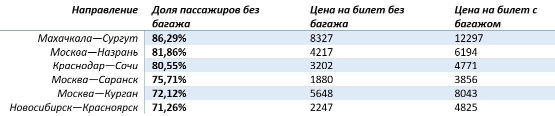 В результатах также присутствует информация о том, какие направления перелетов более всего популярны для путешествующих налегке. Самый популярный маршрут - Махачкала-Сургут. Все результаты - в таблице далее.