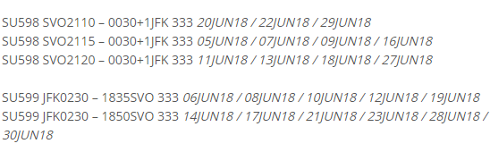 SU598 - номер рейса, JFK - код IATA аэропорта им. Дж. Ф. Кеннеди, Нью-Йорк, SVO - код IATA аэропорта Шереметьево, Москва.
