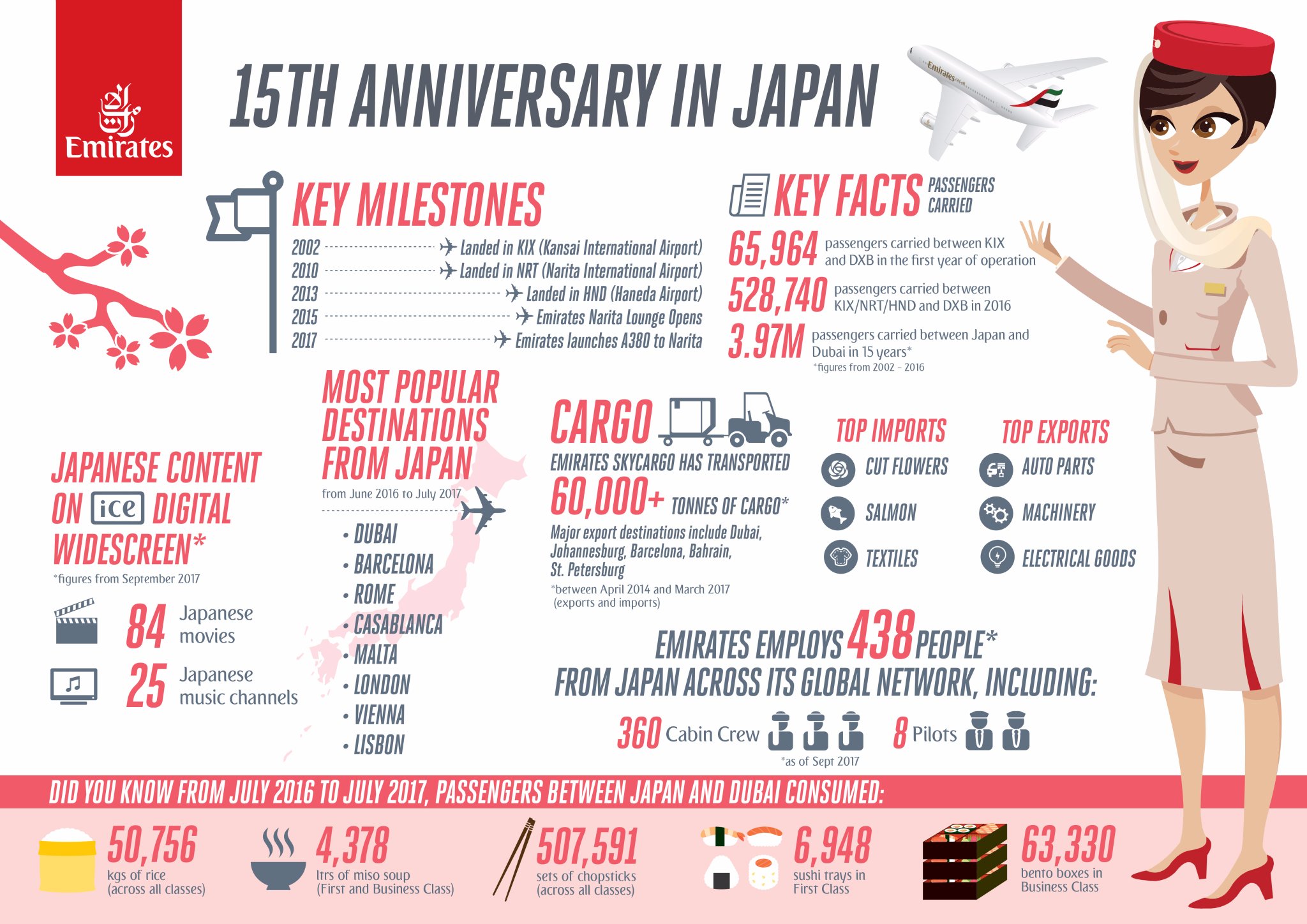 В октябре 2017 авиакомпания Emirates отметила пятнадцатилетие регулярных рейсов в города Японии.