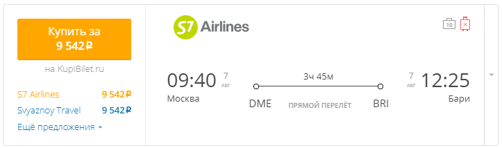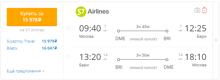 Авиакомпания S7 намерена удвоить число рейсов по маршруту Москва-Бари в период с 7 августа до начала октября. Данный перевозчик является единственным, который обеспечивает прямое авиасообщение между столицей России и административным центром региона Апулия, городом Бари. Обслуживать маршрут будет самолет Boeing 737 с эконом и бизнес классами.