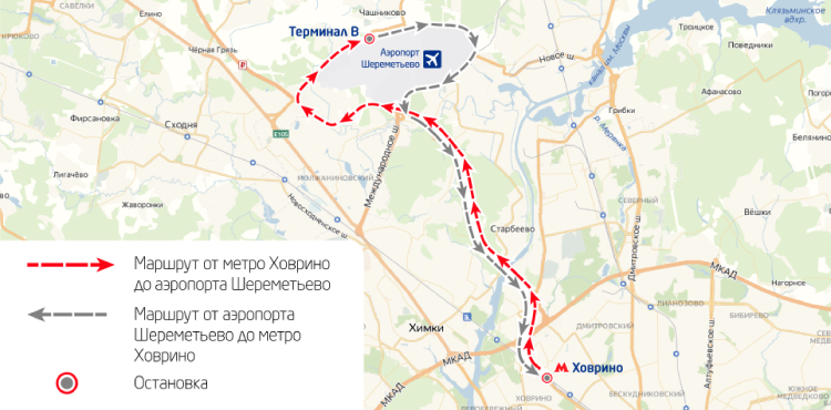 Остановка автобуса расположена у входа №2 со станции метро Ховрино и слева от выхода из терминала В аэропорта Шереметьево.