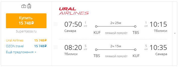 1 апреля, и это не будет шуткой, отправится в полет первый рейс авиакомпании "Уральские авиалинии" из Самары в гостеприимную столицу Грузии, Тбилиси. Один из крупнейших перевозчиков России запланировал еженедельно, по понедельникам и пятницам, осуществлять два полета. Время в пути составит чуть более двух часов, а стоимость в обе стороны составит около 16 тыс. рублей за одного пассажира. В стоимость включено 1 место ручной клади весом до 5 кг и одно место багажа весом до 10 кг. Далее приводим пример данного варианта перелета.