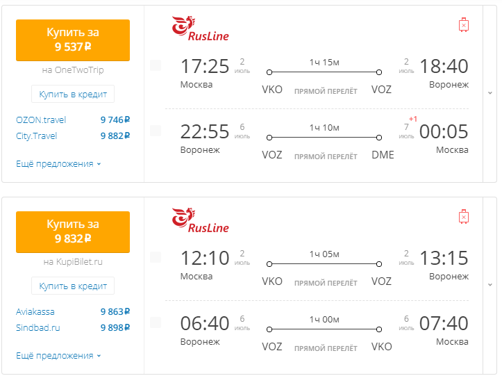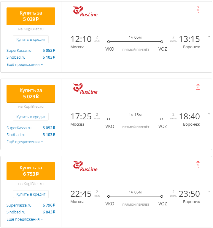 Вылет из Москвы: 12:10, 17:25, 22:45. Прибытие в Воронеж: 13:15, 18:40, 23:50.